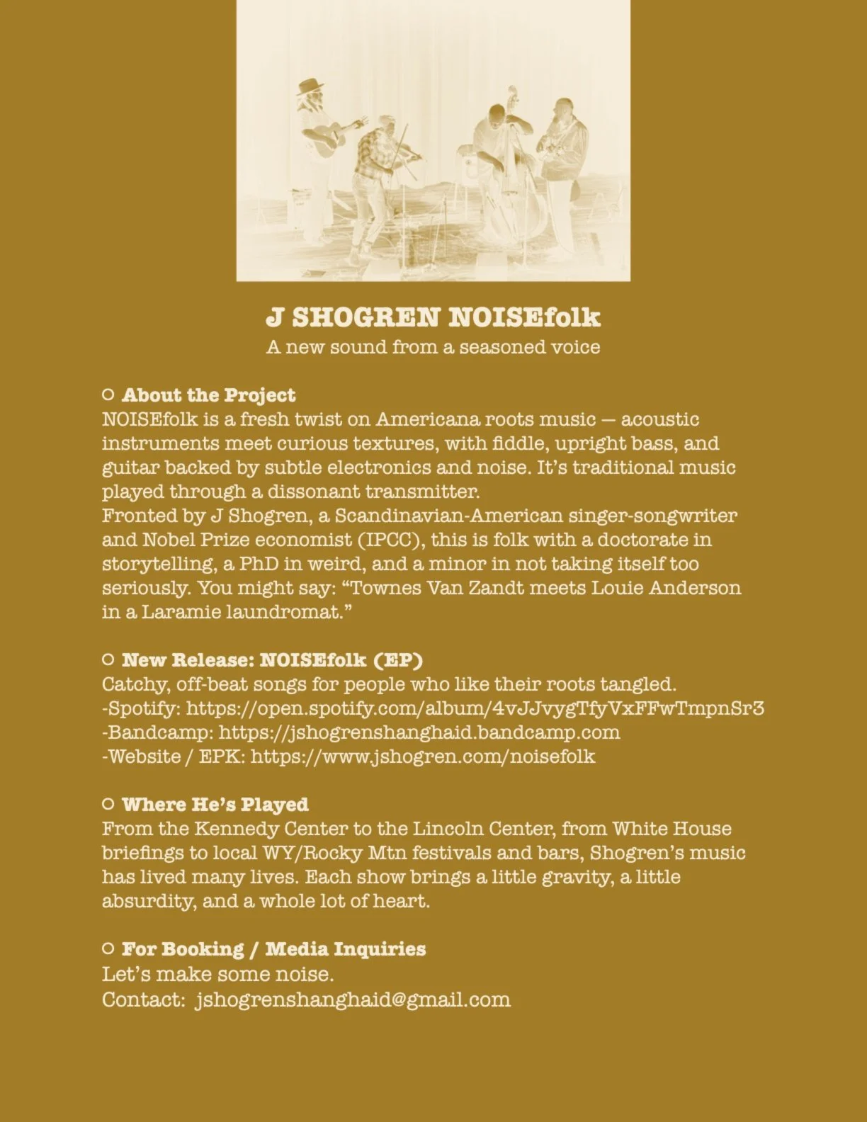 We are - John Wilhelm: guitars / Will Bowling: violin / Mike Lange: bass / J Shogren: Vox, guitar, mandolin